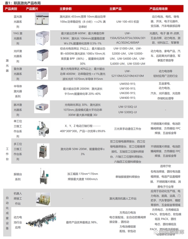 产品布局方面,公司的主要产品包括激光器及激光焊接机、工作台以及激光焊接自动化成套设备(激光焊接系统)等。