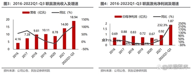 综上,我们预计2022/2023/2024年联赢激光收入分别增长93.4%/52.6%/31%至27.07/41.30/54.11亿元,归母净利润分别增长216.6%/102.9%/40.1%至2.92/5.91/8.28亿元。营收与净利润的高增长主要受益于新能源汽车行业持续高景气,动力电池厂加速扩产来带设备投资额上升,以及公司营收体量扩大下规模效应逐步显现带来期间费用率的降低。