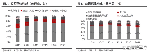 从业务来看,公司收入构成以动力电池行业为主,动力电池营收占比由2016年的52%迅速提升至2018年的77%,随后稳定在70%以上,一方面是受益于下游新能源汽车行业蓬勃发展,另一方面公司基于自身在激光焊接领域的技术优势,积极切入并迅速绑定大客户实现产品放量;营收占比第二的行业为五金及汽配行业,2021年营收占比为12%;2021年IT消费电子营收占比为11%,光通讯行业营收占比较少,为0.85%,其余为其他行业,占比1.25%。