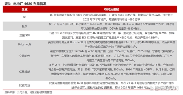 特斯拉主导大圆柱电池,带动多家整车厂入场,电池厂加速布局产能。目前特斯拉德州超级工厂已在批产搭载于Model Y的4680电池。宝马4695电池有望在2024年量产,或成为其纯电平台Neue Klasse的主力电池。此外,蔚来、江淮、保时捷、东风岚图等多家整车厂也明确表示旗下车型将会搭载4680大圆柱电池。在此背景下,国内海外电池厂加速布局大圆柱电池产能。