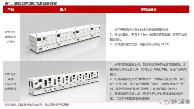 联赢激光提前布局纽扣电池焊接设备解决方案,有望迎来收获期。针对纽扣电池在焊接过程中的各种痛点及难题,联赢激光顺势进行一系列积极的技术升级,并探索出行业领先的纽扣电池装备智造方案,包括UW纽扣电池电芯组装线及UW纽扣电池PACK自动组装线,可根据客户需求进行相应配置调整,兼容8-16mm的电芯装配制造,配备焊中实时监控技术及视觉尺寸分选技术,焊接优率高达99.5%。