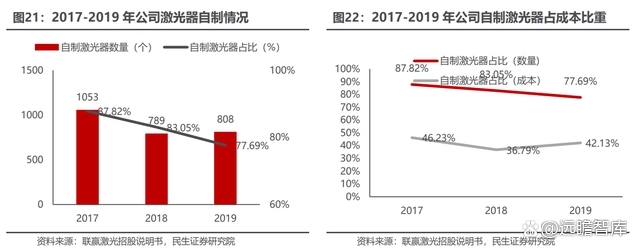 成本占比来看,2017-2019年公司自制激光器成本占比为46.23%、36.79%、42.13%,与数量占比严重不匹配主要系外购激光器价格较高,具备进一步垂直整合降本的空间。