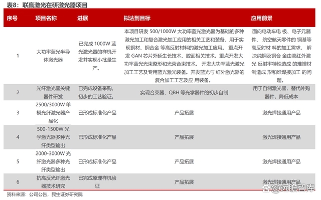 激光器研发方面,公司目前开发完成具备全部自主知识产品的500W-6000W光纤激光器、1000-3000W半导体激光器、最大负荷功率3000W-6000W复合激光器及1000W蓝光激光器。