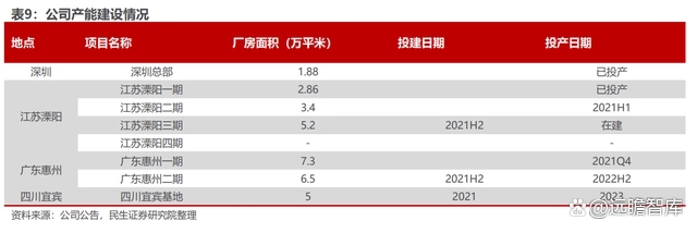 广东惠州一期约4.7万平米生产厂房于2021年四季度投入使用,同时于2021年下半年开启二期约5万平米厂房建设,预计将于2022年下半年实现投产。四川宜宾一期7500平米生产基地已与2022年上半年投产,二期5万平预计2023年投产。