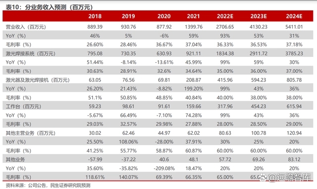 我们预计2022/2023/2024年公司激光焊接系统收入分别为3.17/4.54/6.15亿元,同比增长99%/43%/36%,毛利率28%/28.5%/29%。