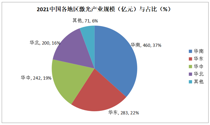 根据Laser Manufacture News调研数据分析:2021年同比去年增长18%,全国工业激光上中下游产值达1256亿元。各板块市场规模中,华南仍然是激光产业规模最大的地区,产值达到460亿元,华东地区激光产业约为283亿元,华中地区约242亿元,华北地区则有200亿元,西部地区(四川、重庆、陕西、山西、甘肃等)预估激光产值约71亿元。