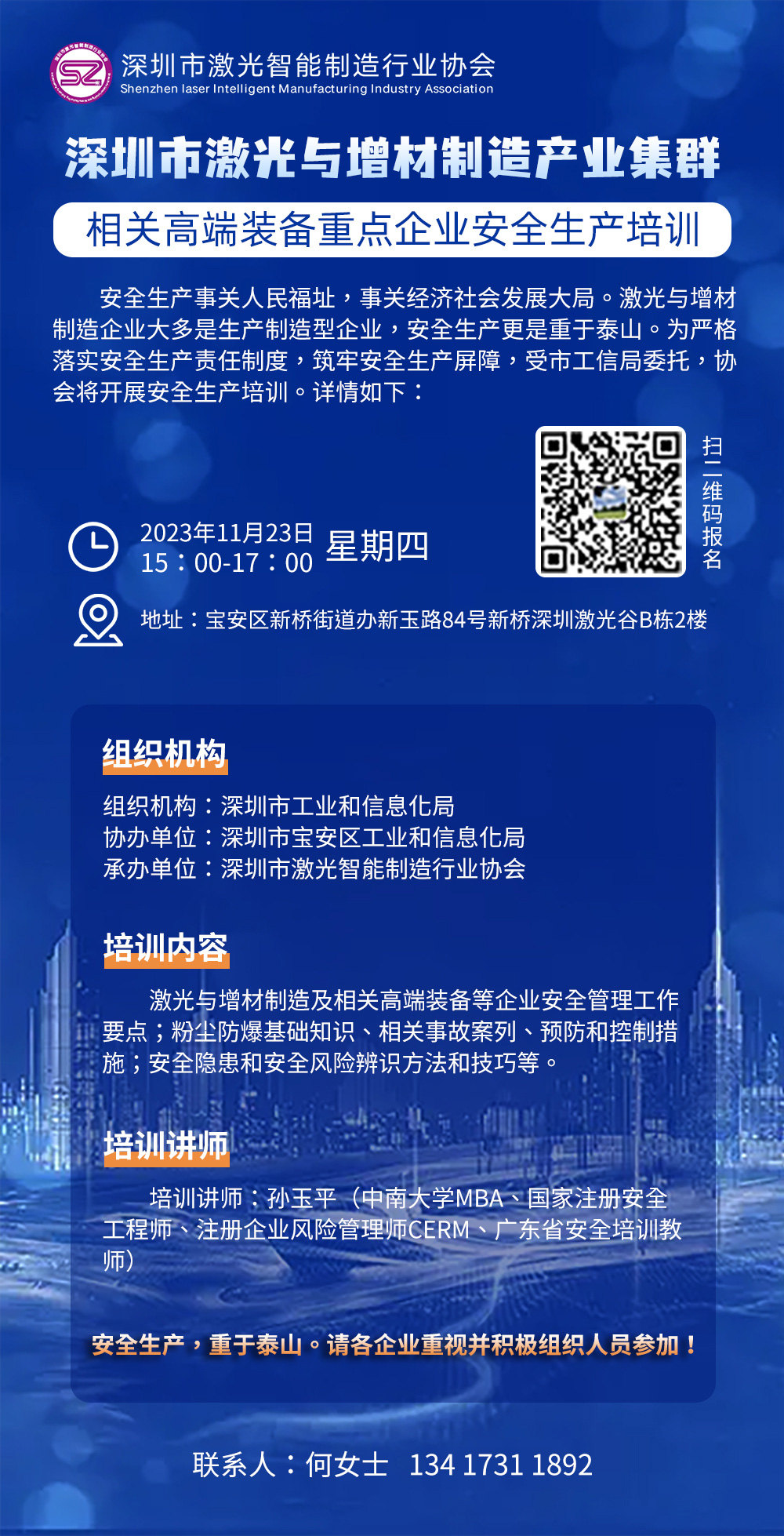 深圳市激光与增材制造产业集群及相关高端装备重点企业安全生产管理人员。报名人数仅限70人。孙玉平(中南大学MBA、国家注册安全工程师、注册企业风险管理师CERM、广东省安全培训教师)