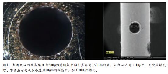 图 1 中显示了光纤激光打标机是可以替代 EDM 机器的。左图中显示了使用光纤激光打标机,在厚度为200μm 的钢板中钻出直径 150μm 的孔,孔径公差为 ±10μm,无需后处理工作。仅使用 EDM 设备所需时间的 50%,光纤激光打标机就实现了最小量的碎屑和紧密孔径公差加工。