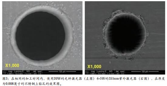 图 3 中比较了在相同的加工时间内,分别使用 20W 的光纤激光器(左图)和 5W 的 355nm 紫外激光器(右图),在厚度为 0.008 英寸的不锈钢上钻孔的效果图。