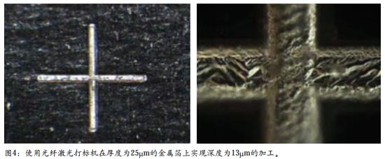 图 4 中突出显示了使用单模光纤激光器可能实现的精细度和加工控制,在此,光纤激光打标机用于在厚度为 25μm 的金属箔上实现深度为 13μm 的加工。加工的通道宽度为 75μm,整个区域内的深度变化为±1μm。