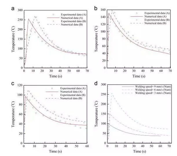 在每个焊接速度下,温度分布在接近激光束中心处急剧减小,然后在离激光束中心的较远区域中略微减小。随着焊接速度的增加,温度下降,并预测在较小的温度下,熔池有较小的宽度。熔池的宽度随焊接速度的增加而降低,且模拟结果与实验一致。熔池的深度随着焊接速度的增加而降低。