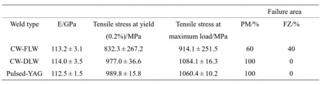 研究表明Nd:YAG激光器加工后的焊接质量高于用光纤激光器或二极管激光器产生的焊缝。三种焊接类型的硬度值非常相似。但是强度和塑性不同,这主要是受到不同类型孔的焊接缺陷的影响。三种焊接形式的力学性能如表4.2所示。
