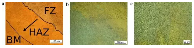 图3.3 1kW,50mm / s下的HAZ显微组织。(a) HAZ的放大;箭头指向从FZ相邻的富含α'区域到BM附近的贫α'区域。(b)HAZ / BM界面(HAZ位于右侧)的微观组织。(c)b的放大。
