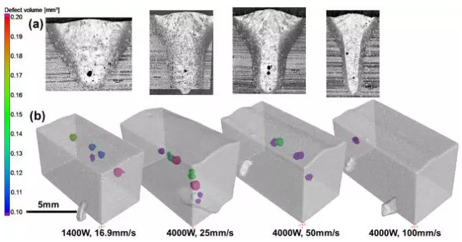 这是因为功率一定时,热源前进的速度越慢,热量在材料局部消散的就越多,这将导致在熔融区域内形成更复杂的流体流线系统,从而允许捕获更多的气孔。加工诱导的气孔依赖于三种工艺参数,板厚,激光功率以及扫描速度。在厚板和高能量密度的条件下,孔出现的几率更大。并且气孔主要是球形的,沿焊接线分布,直径为0.38 – 1.16 mm。