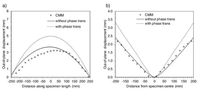 图5.5 模拟(a)翘曲,(b) 有和没有相变的平面失真角度的大小